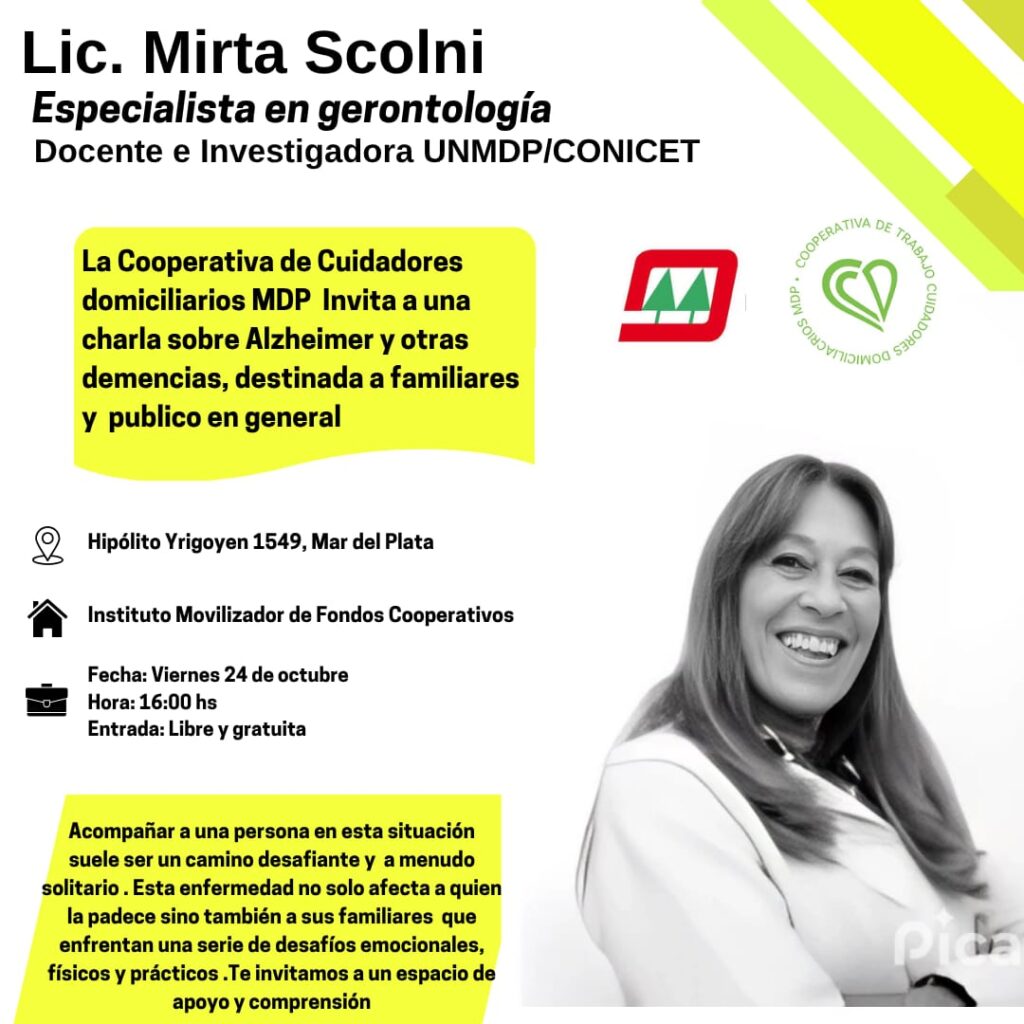 La Cooperativa de Cuidadores Domiciliarios Mar Del Plata invita a participar de una charla a cargo de la Lic. Mirta Scolni, Especialista en Gerontología, docente e investigadora de la UNMDP y CONICET.